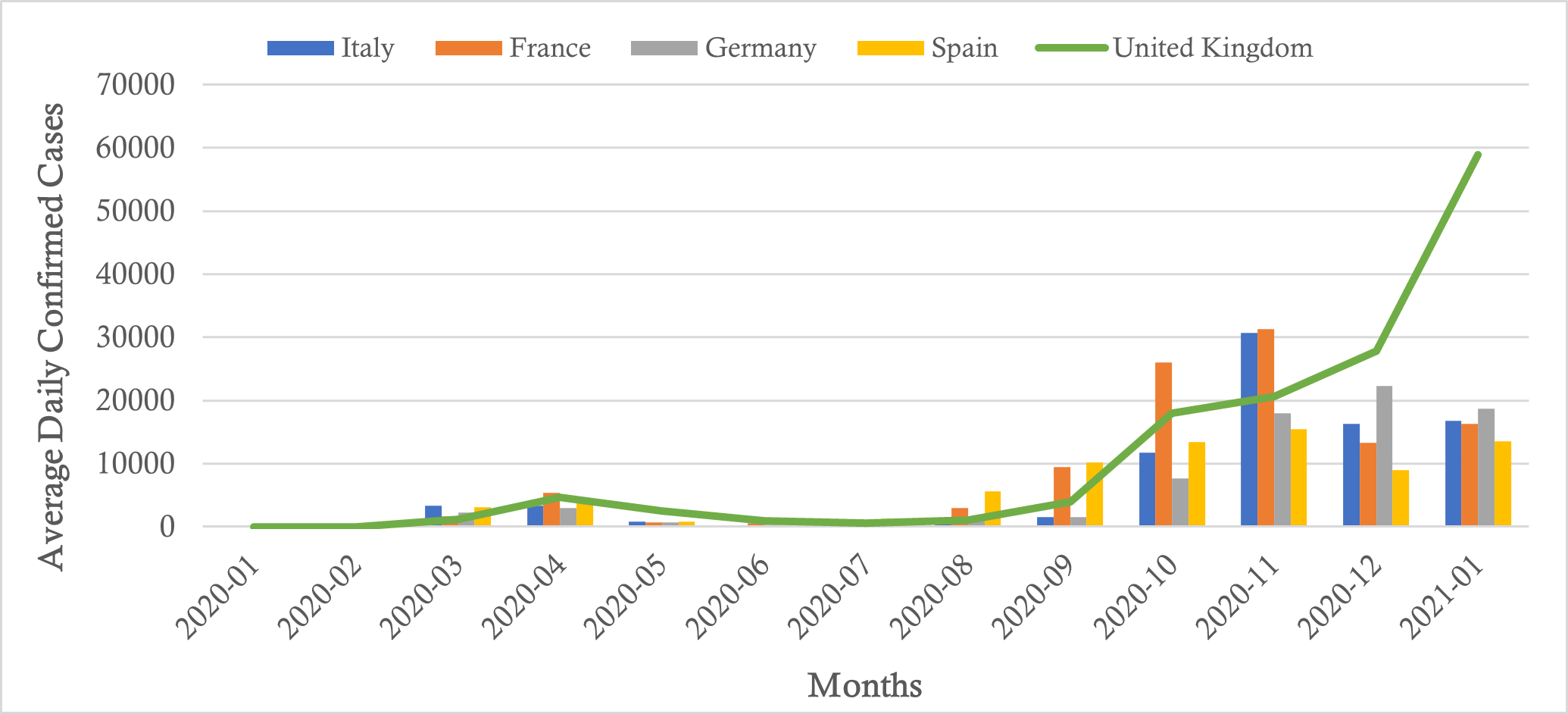 The first assignment of the year was for the module ‘Machine Learning and Big Data’ and taught us how to use the Spark processing engine to help us process daily COVID cases data from John Hopkins University. It was an enlightening task, as we used newly acquired skills to perform real-world data analytics operations on the very same data that scientists and analysts across the world were working on. One of the graphs I generated as part of the report can be seen below and shows the steep rise in COVID cases across the UK compared to other countries in Europe.