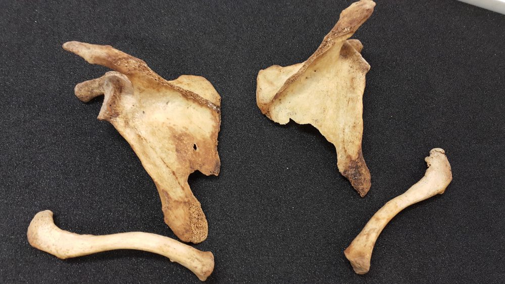 Differently shaped left and right shoulder blades on another skeleton show signs of wear and tear