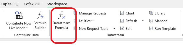 - From the Workspace Excel menu options choose Datastream Formula (as shown above). A search form will appear.