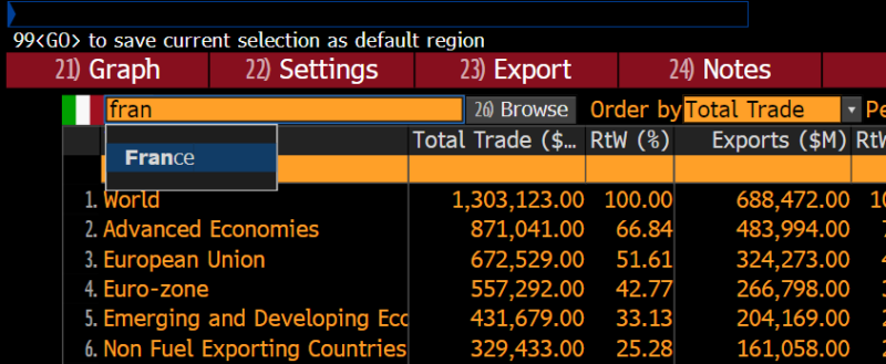If so, the Bloomberg terminal has a rather nifty function where you can view and analyse international trade… an interactive trade flow map which displays import and export values between a selected country and its global trading partners.