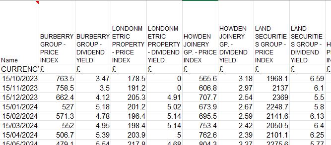 - The example below uses our amended FTSE 100 list to retrieve monthly figures for price index and dividend yield for our specified companies.