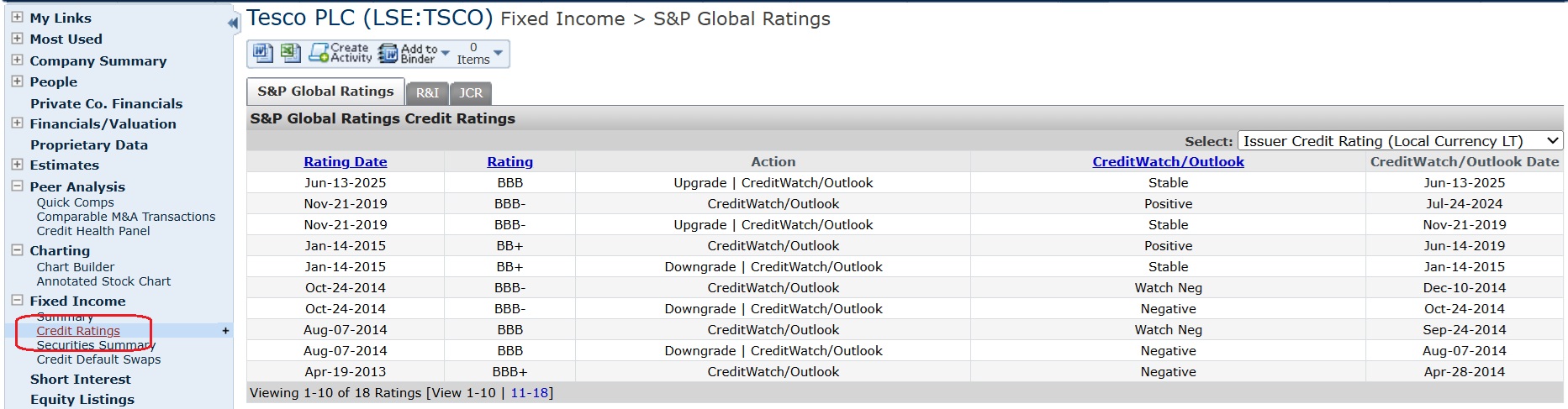 You will also find S&P Credit ratings on their Capital IQ platform. Simply select credit ratings from the ‘Fixed Income’ menu that can be found at the left hand side of the company profile. Remember to create an account if you wish to use Capital IQ.  This blog post explains how to register.