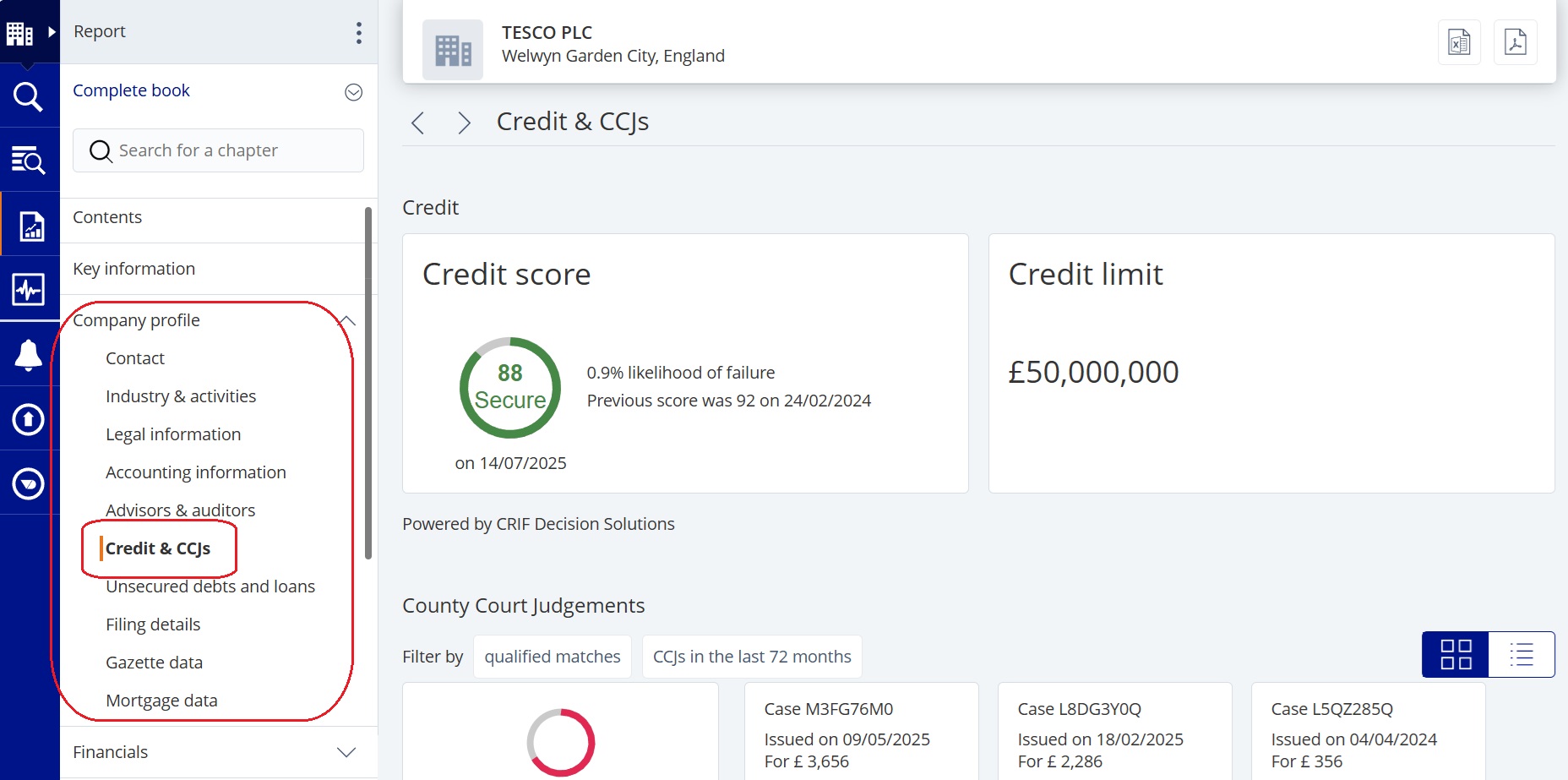 Fame has a credit rating system for UK and Irish companies, developed by CRIF Decision Solutions in collaboration with Jordan’s. It provides a numerical score and the likelihood of a company becoming insolvent. To view the credit rating for a company, open the ‘Company profile’ section of the left-hand report menu and select ‘Credit & CCJs’.