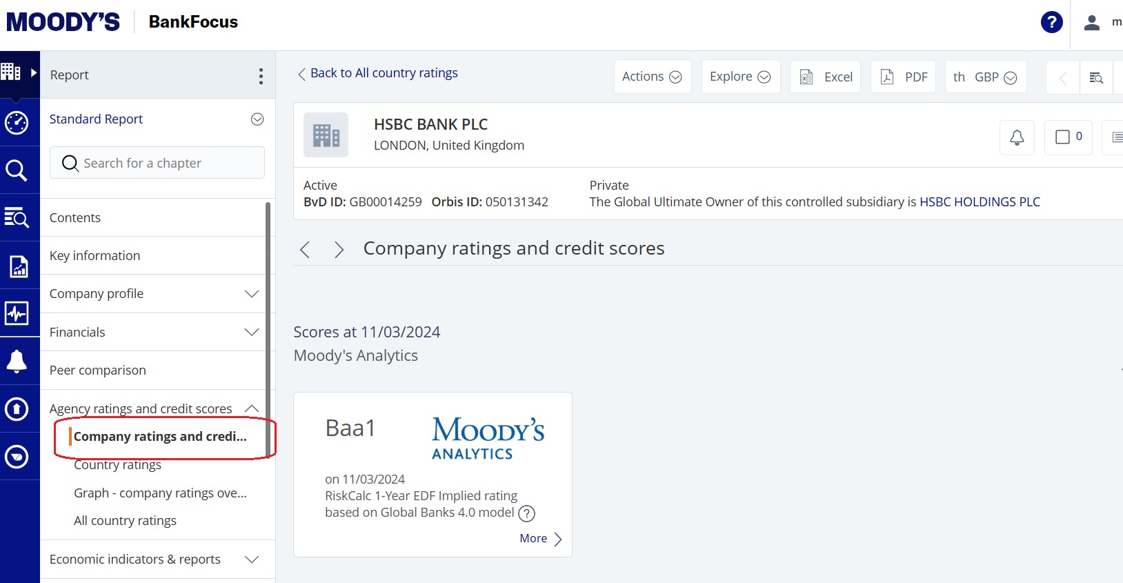 BankFocus, our global financial accounts database for banks and financial institutions, has Moody’s ratings listed for companies. These appear under the ‘Agency ratings and credit scores’ heading on the left hand menu of a bank’s report screen.