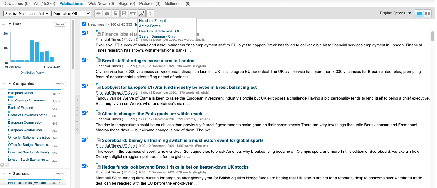 This will take you directly to the Factiva webpage listing Financial Times article titles from the last 3 months, in order of most recent first. Remember, you won’t see articles from the last month because of the embargo.