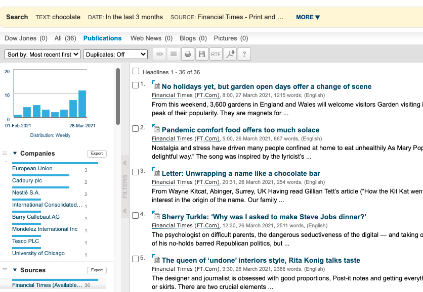 You can see that my search results are all FT articles. To double-check the parameters of your search, look at the pale yellow header box.