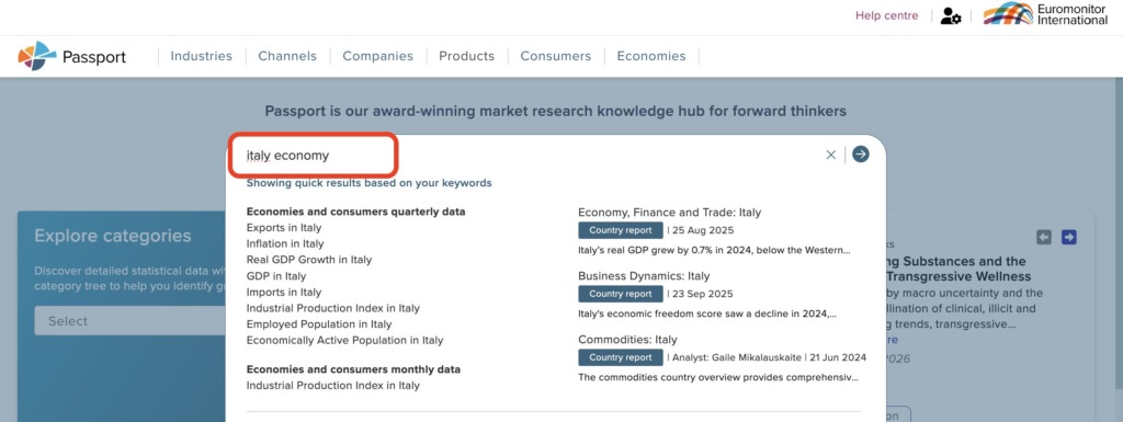 Passport provides PEST analyses, Business Dynamics and Economy, Finance and Trade reports for individual countries. To access these, the easiest option is to type your country name and the word ‘economy’ and click to search.