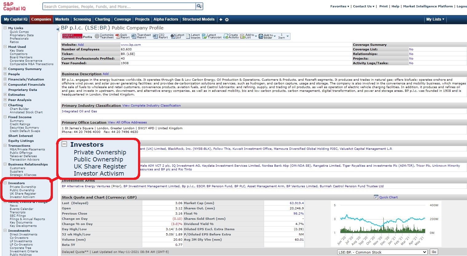 Access Capital IQ’s shareholder information via the ‘Investors’ menu in the left-hand menu.